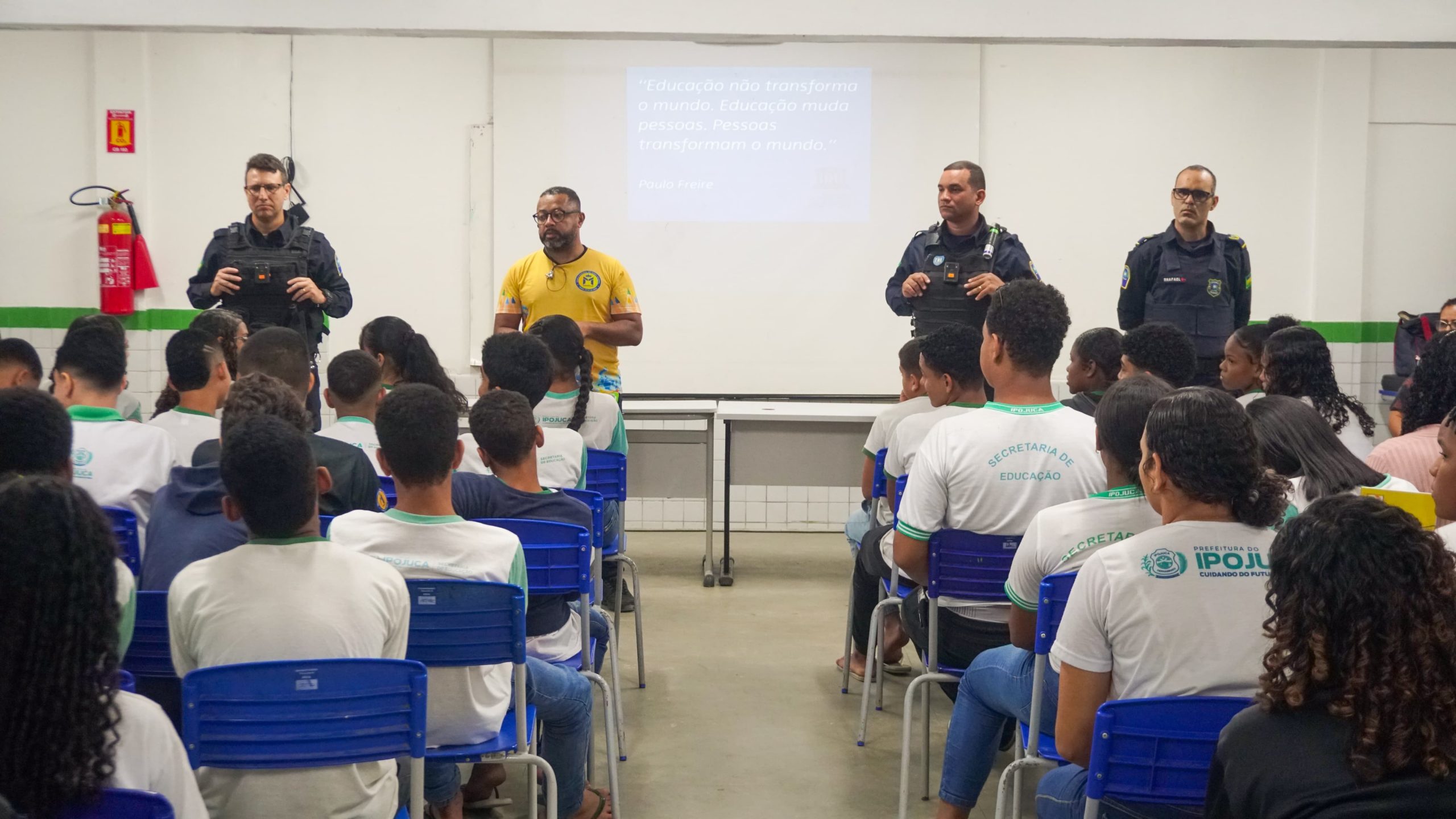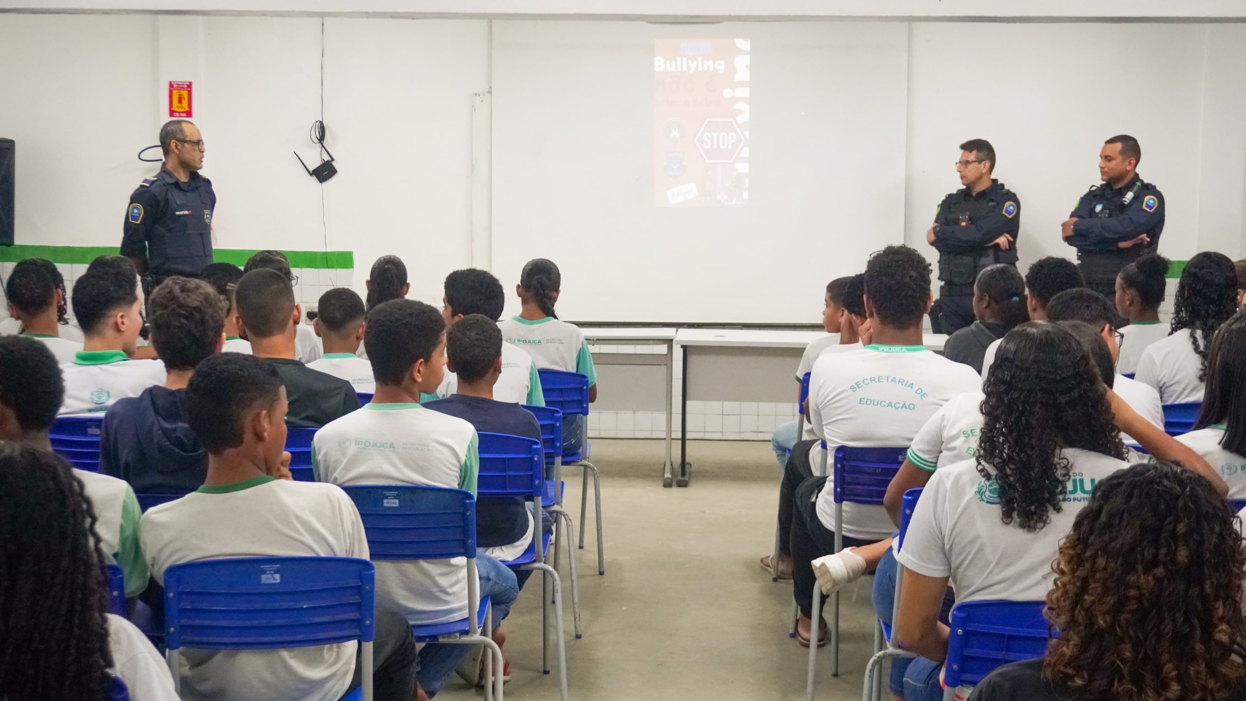 Com o objetivo de combater a violência além conscientizar sobre o bullying, dentro e fora da escola, a Prefeitura do Ipojuca, por meio da Secretaria da Defesa Social, em parceria com a Secretaria de Educação, promoveu uma palestra, nesta terça-feira (23), na Escola Municipal em tempo integral Mário Júlio do Rego, em Nossa Senhora do Ó. A atividade tem alusão ao Abril Azul, mês de conscientização sobre o autismo, e abordou temas como: “Prevenção ao bullying, violência física e atos infracionais diversos” e “Responsabilização ao cometer atos infracionais diversos”. A ação aconteceu nos períodos da manhã e tarde, no auditório da unidade de ensino, com capacidade máxima de 100 pessoas.