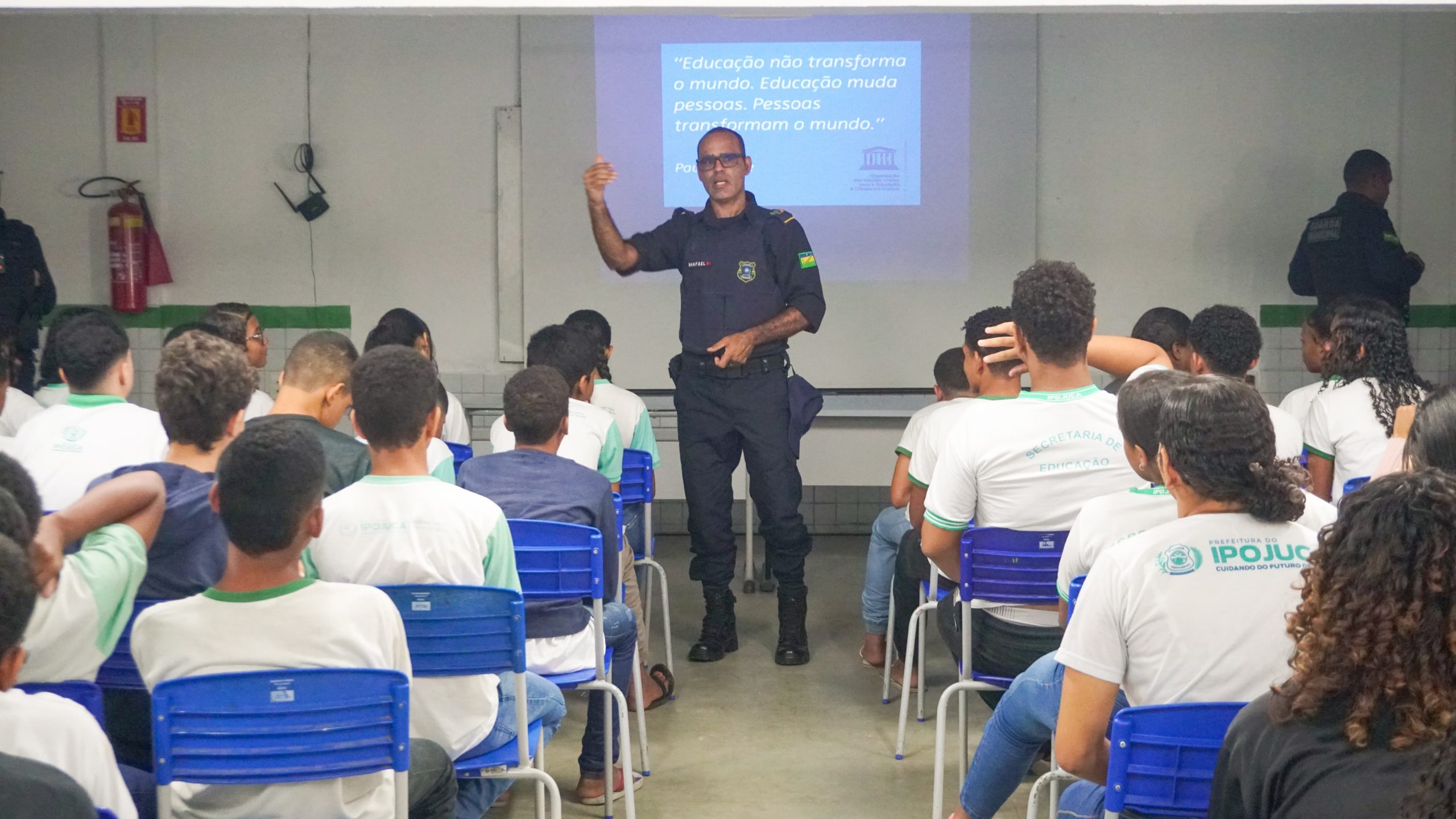 “Momentos como estes enriquecem o trabalho da Patrulha Escolar Municipal. É com imenso prazer que damos apoio às unidades escolares, pois assim podemos preservar seu patrimônio, proteger os profissionais de educação e estudantes da rede pública municipal. Realizar atividades ostensivas como essas garantem lei e ordem, pois prima pelas condições mais favoráveis para a relação ensino-aprendizagem, prevenção e repressão ao uso e tráfico de drogas e outros ilícitos,” declarou o subcomandante, Rhafael Gomes.