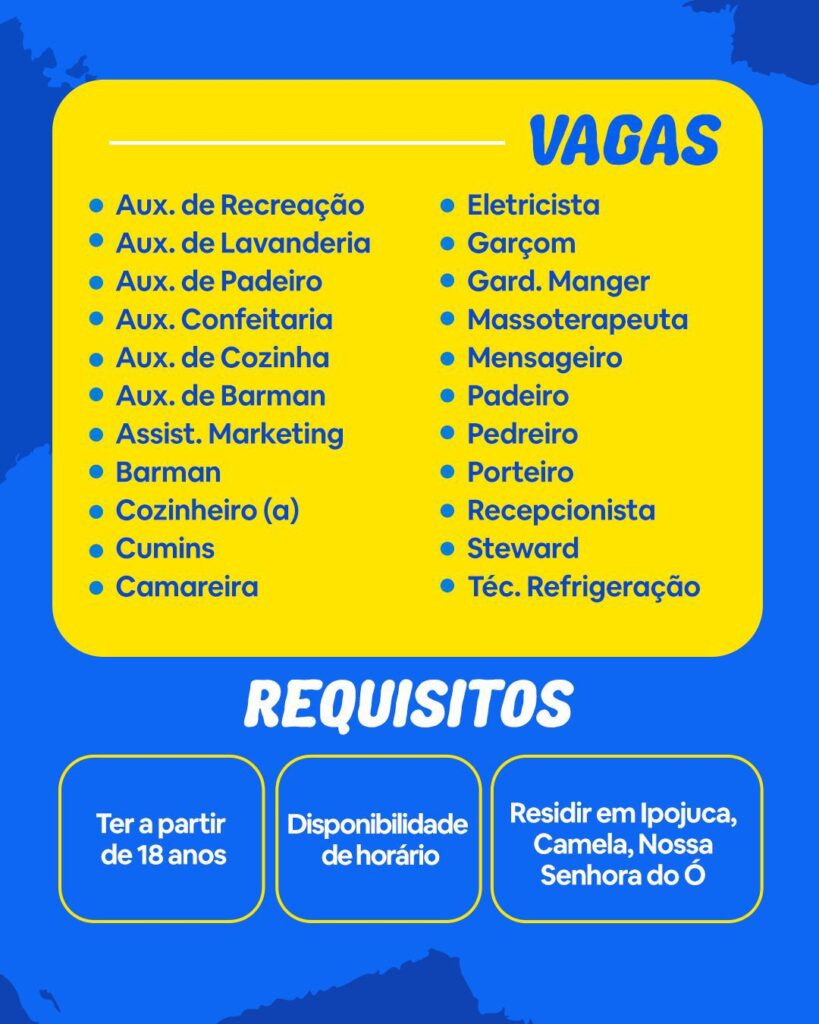 Entre as oportunidades disponíveis estão cargos como auxiliar de recreação, auxiliar de lavanderia, auxiliar de cozinha, cozinheiro(a), camareira, cumim, barman, assistente de marketing, eletricista, garçom, pedreiro, porteiro, recepcionista, técnico em refrigeração, massoterapeuta, mensageiro, entre outros.