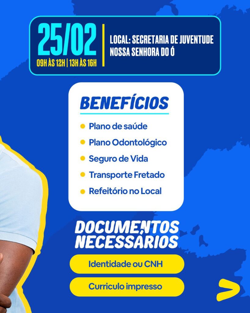 A ação acontece na Secretaria de Juventude, em Nossa Senhora do Ó, das 9h às 12h e das 13h às 16h, reunindo diversas vagas de emprego em áreas como hotelaria, serviços, comércio, construção civil e manutenção.