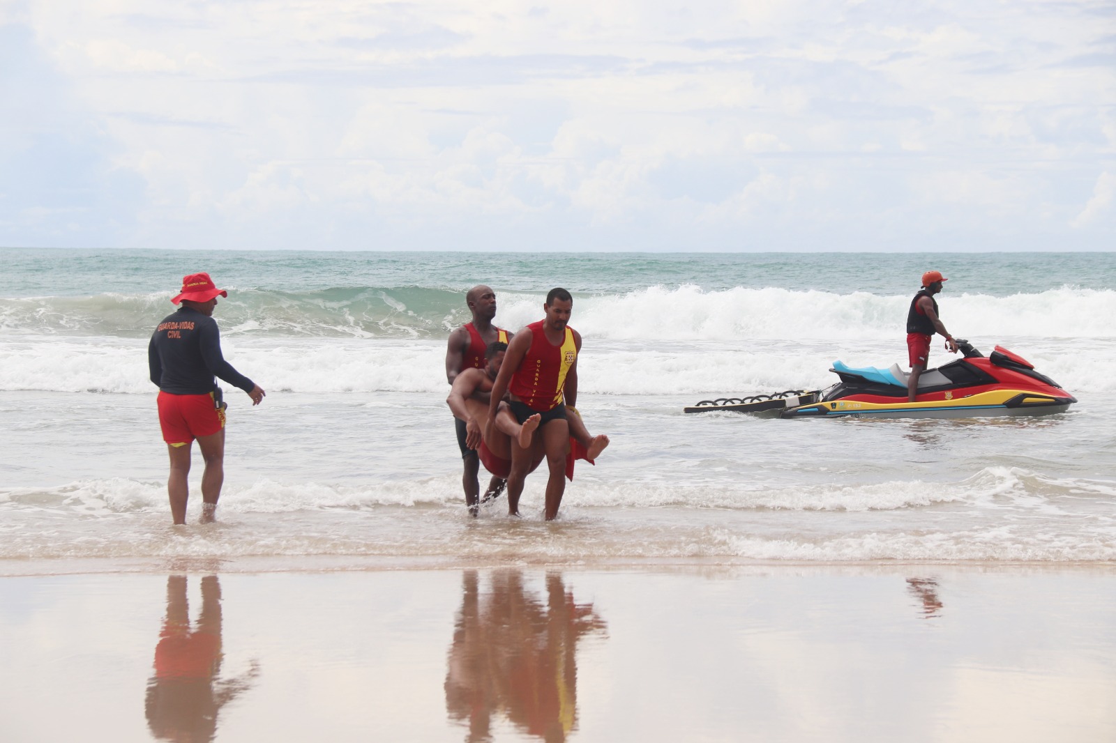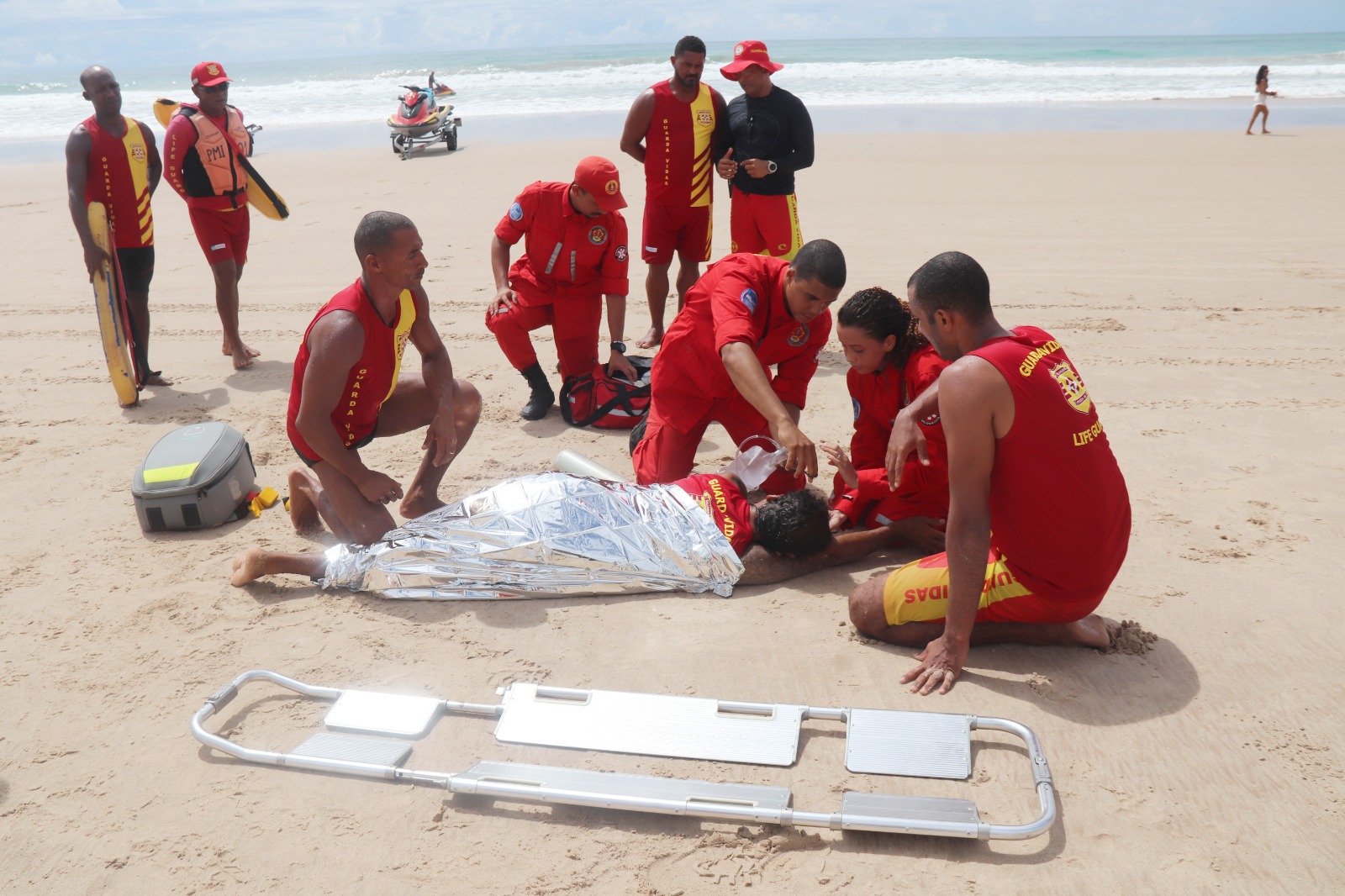 Durante as simulações realizadas na orla da praia de Porto de Galinhas, cada grupo de salvamento precisou detectar o grau de afogamento da “vítima” e realizar os procedimentos adequados.
